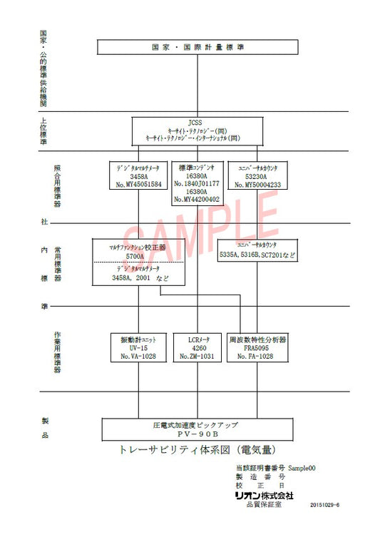 ・校正証明書 … この文書は、当社が製品の校正に使用した標準器が、国家の基準や世界の基準に沿った公的機関による上位の標準に基づいている(トレーサビリティがある)こと、そしてその標準器を使って、当社独自の校正基準に従い校正作業を実施したことを公式に表明する内容です。